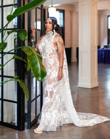 Featured above is The SASHA, by Margo West. A stunning a delicate sheer floral lace one piece jumpsuit with a modern and classic high fastened neckline. This is an absolutely STUNNING, sexy, and SHEER with a wide back strap and amazing detachable cape.